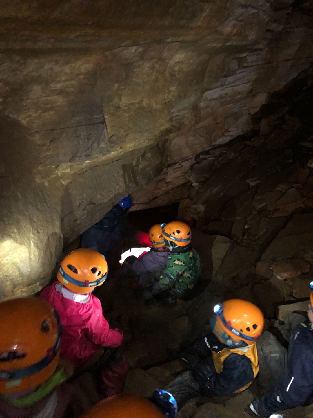 Å dra på grottetur gir barna en unik og spennende naturopplevelse. Det er spennende å klatre og smyge seg mellom store steiner og ganger i mørket.